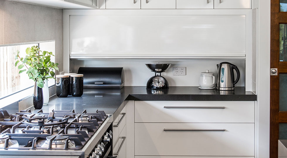For the ultimate in storage convenience combine a Tambortech Door with a wide benchtop to create a beautiful, sleek yet practical kitchen.