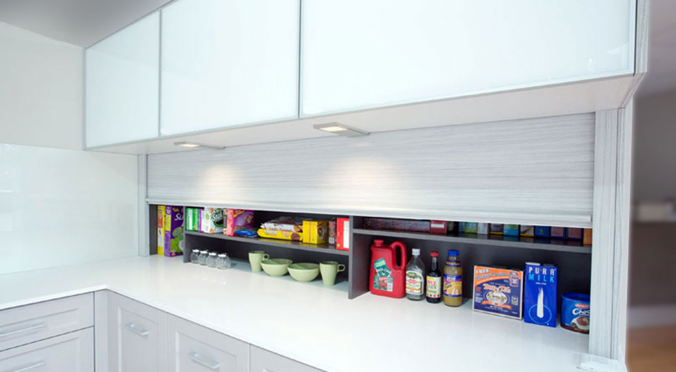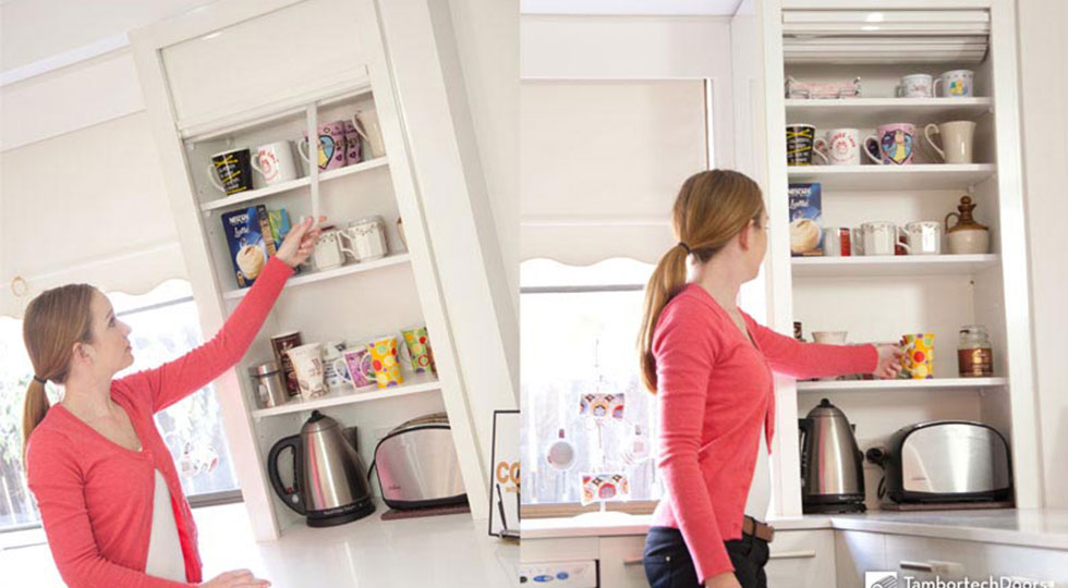 Overhead cupboard doors can be awkward to use, but, with a full height Tambortech Door every shelf of your cupboard can be easily accessed.